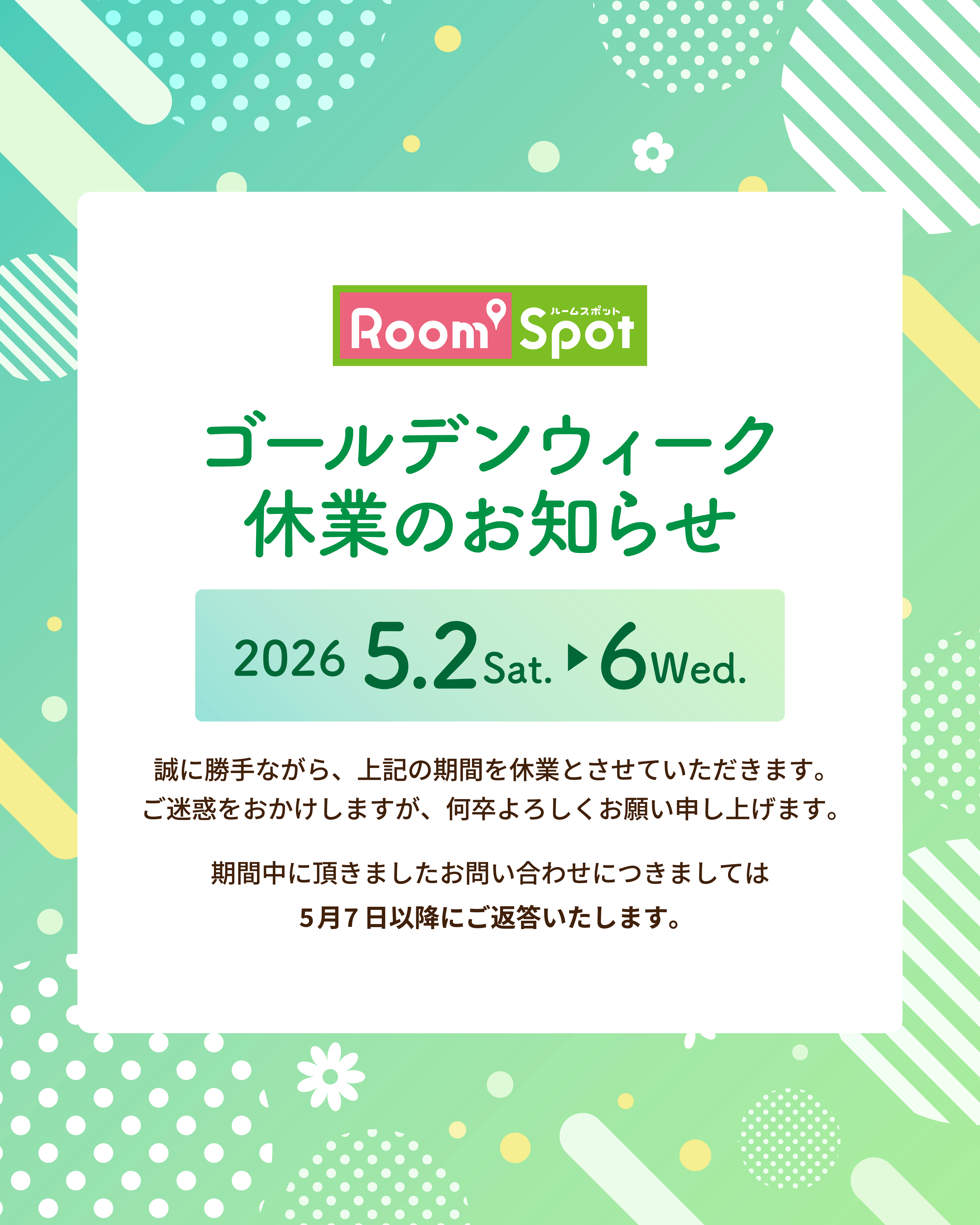 2026/04/21 ゴールデンウイーク休業のお知らせ 2026年5月2日(土)~5月6日(水) 誠に勝手ながら、上記の期間を休業とさせて頂きます。 期間中のホームページへのお問合せにつきましては、5/7(木)以降でのご返答となります。 大変ご迷惑をお掛け致しますが、何卒よろしくお願い申し上げます。